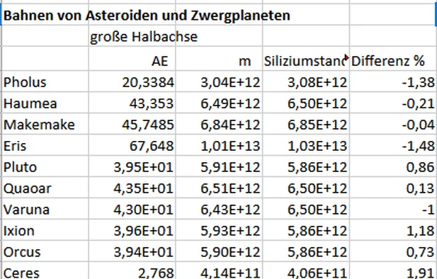 Die Daten der Planeten, Zwergplaneten und Asteroiden (Tabelle 5, 5.3) ordnen sich in das Wellenlängenschema sehr gut ein. Es bestätigt sich noch einmal , das die Sonne, ihre Planeten und die Monde der Planeten einen gemeinsamen Wellenraum haben.