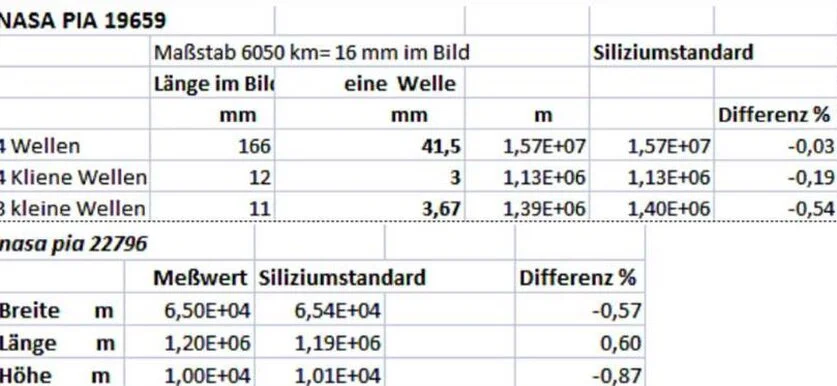 Von der NASA/Photojournal wird ein umfangreiches Bildmaterial veröffentlicht. Das Ausmessen der Strukturen auf diesen Bildern ist auf Tabelle 7 zu finden.