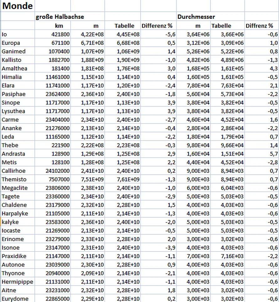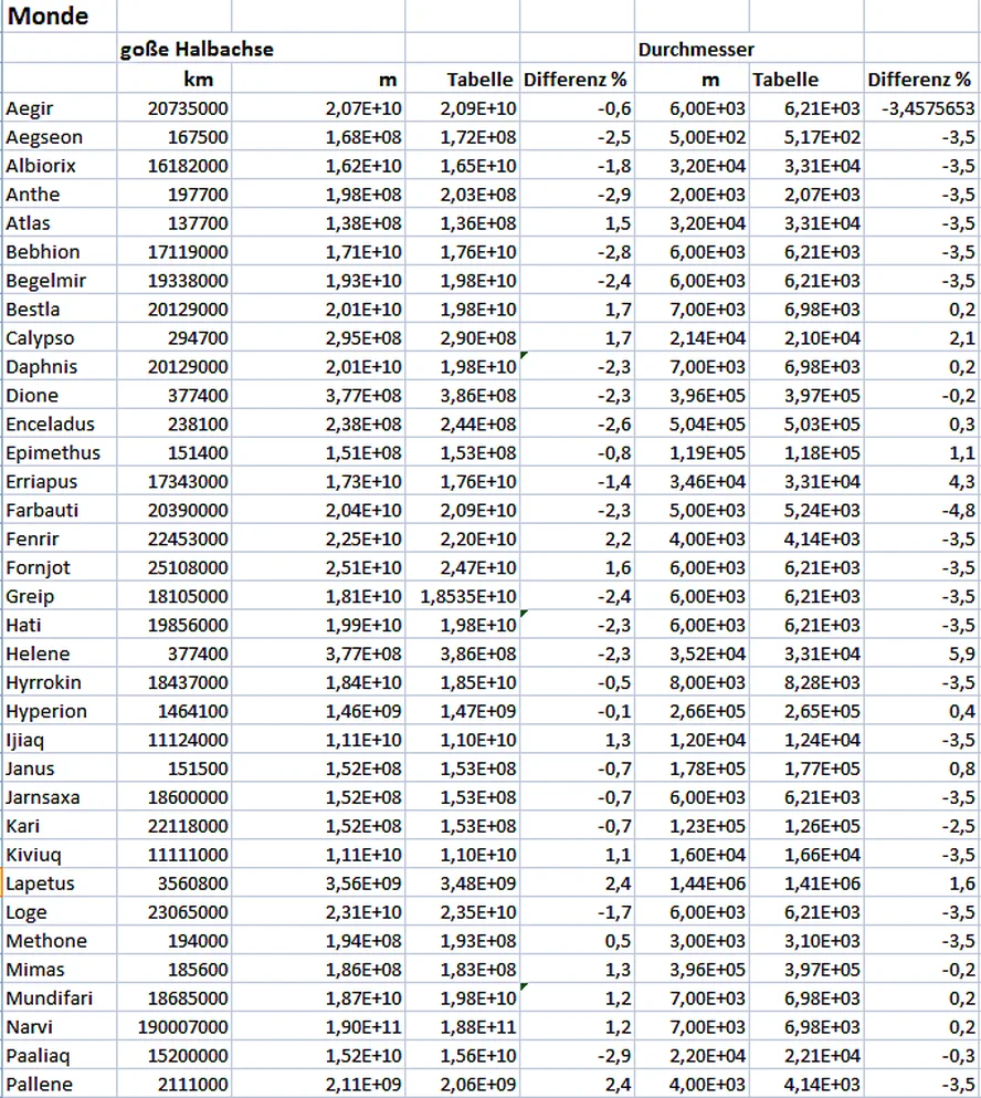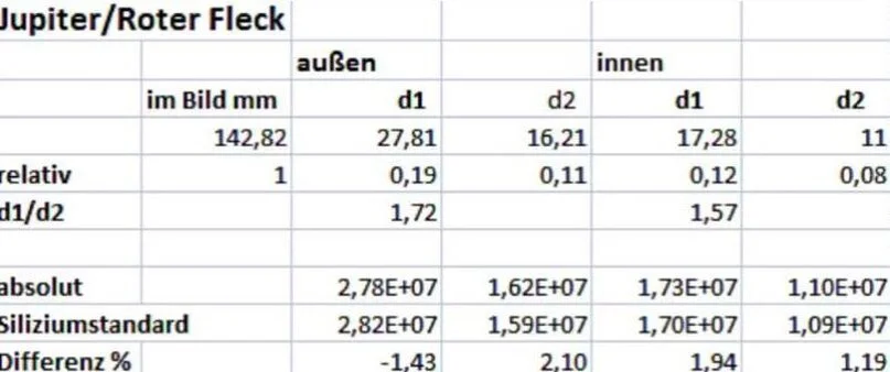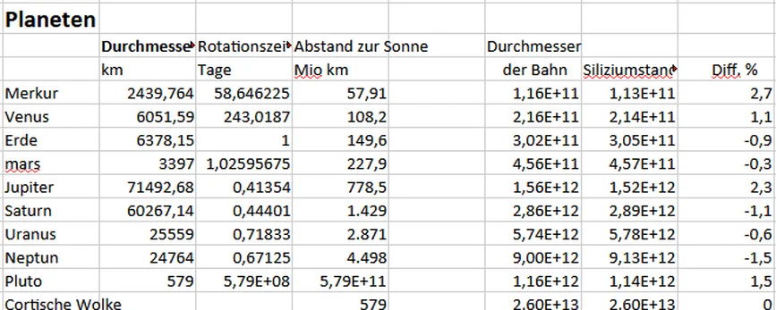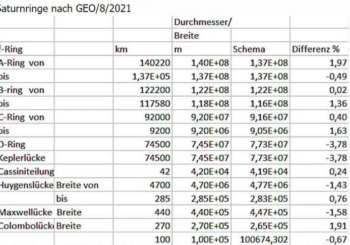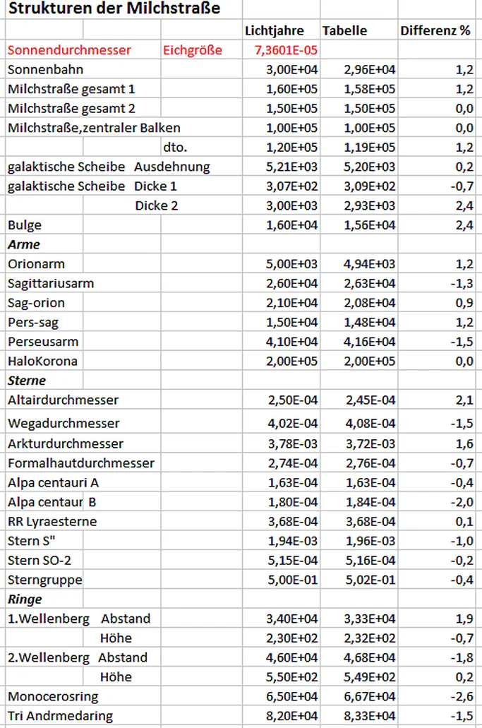 Tabelle 21 zeigt den Vergleich gemessener Daten (Durchmesser) mit Daten nach dem Wellenlängenschema. Sie stimmen wie fast alle kosmischen Objekte gut mit den Werten des Wellenlängenschemas überein.
