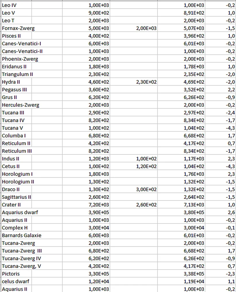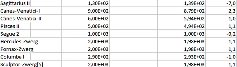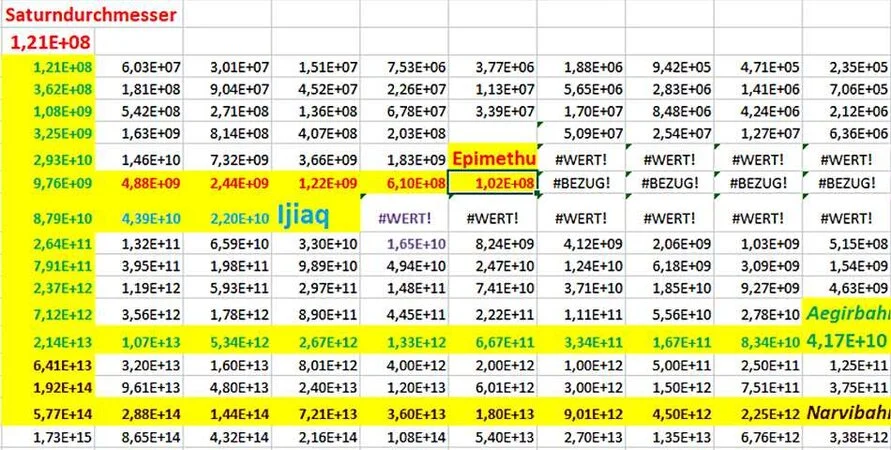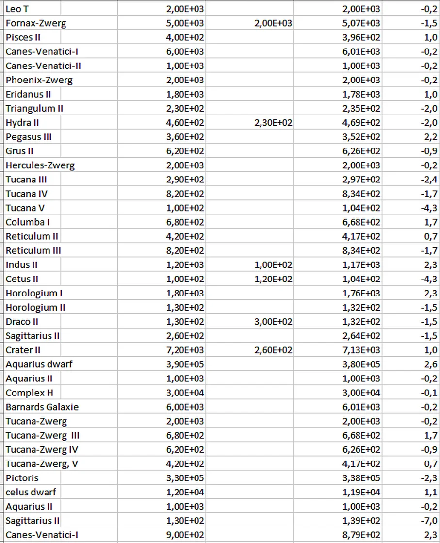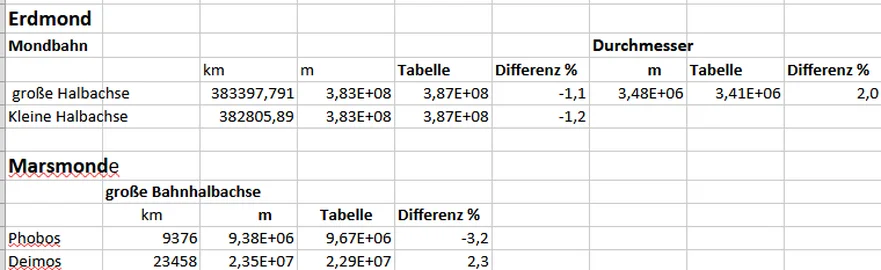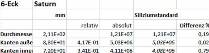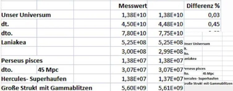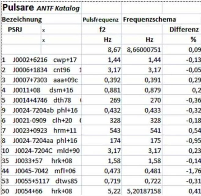 Tabelle 21 zeigt den Vergleich gemessener Daten (Durchmesser) mit Daten nach dem Wellenlängenschema. Sie stimmen wie fast alle kosmischen Objekte gut mit den Werten des Wellenlängenschemas überein.