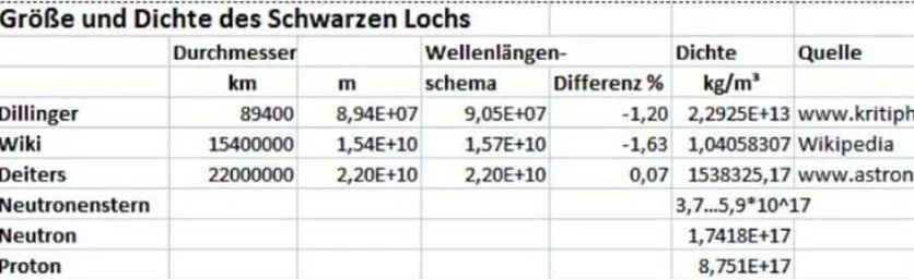 Alle Angaben zur Größe des Schwarzen Lochs passen gut in das Wellenlängenschema. Die damit berechneten Werte für Dichte sind aber viel zu gering sind, wenn man eine Dichte erwartet, die noch größer als die der Neutronensterne ist.