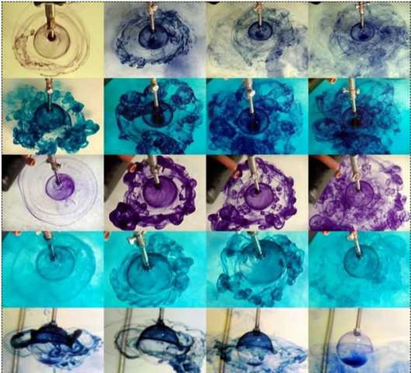 Bei den Versuchen wurde Farbe oberhalb der Kugel an der Drehachse eingespritzt. Durch die Rotation entsteht ein Wellenraum, dessen Wellen die Farblösung in radialer Richtung transportieren. An der Oberfläche der Wellenstrukturen geht infolge der Diffusion etwas Farbstoff über und macht die Oberfläche der Struktur sichtbar. Ein weiterer Stofftransport in das Innere der Struktur findet nicht statt. Daraus folgt, dass es keine Strömung von der Oberfläche der Struktur nach innen gibt.