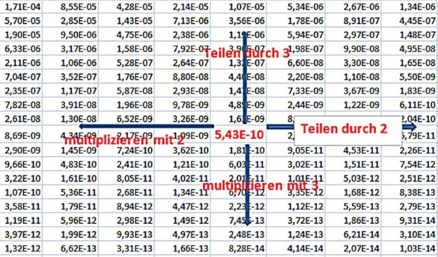 - Die weiteren Werte erhält man durch teilen oder multiplizieren mit den Zahlen "2" oder "3"