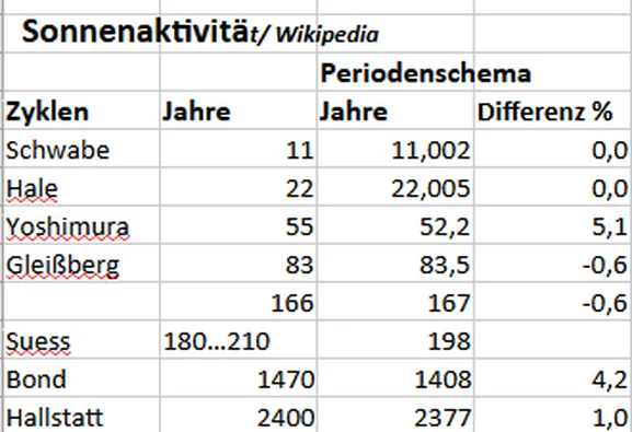 Bis auf die Daten der Strahlungszone gibt es bei den Abmessungen der Sonne eine gute Übereinstimmung zu den Werten des Wellenlängenschemas. Der Einfluss der Wellenstrukturen zeigt sich auch in den Zyklen der Sonnenaktivität (2). Das Periodenschema wurde aus dem Wellenlängenschema berechnet.