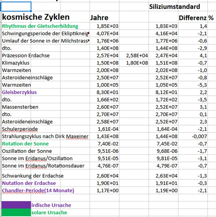 Für das Universum ist die Größe für "D" unbestimmt. Es ist aber auch möglich, ein Wellenlängenschema aufzustellen, indem man für Berechnungen eine andere Größe, die im Kosmos vorkommt , verwendet. Für diese Größe werden die Exponenten "p" und "v" auf den Wert "0" gesetzt. (Weitere Erläuterung Tabelle 1). Die beste Übereinstimmung zwischen gemessenen Werten und den Werten im Wellenlängenschema erhält man, wenn für das Wellenlängenschema den Gitterparameter von Silizium verwendet. " Der Gitterparameter von Silicium, das eine Diamantstruktur ausbildet, wurde mit sehr großer Genauigkeit gemessen und beträgt 543,102 0504 (89) pm / Wikipedia[1]". Die für das Wellenlängenschema mit Hilfe des Gitterparameters berechneten Werte werden im folgenden Text als Siliziumstandard bezeichnet.