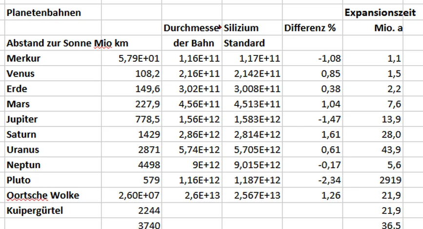 Das Sonnensystem ist durch die Expansion der Ursonne entstanden. Im äußeren Wellenraum der Sonne und alle zur Sonne gehörenden Objekte nach dem kosmischen Wellenlängengesetz angeordnet. Die Durchmesser der Planeten, die Planetenbahnen, die Rotationsperioden und die Umlaufperioden stimmen bemerkenswert gut mit Daten aus dem Wellenlängen-und Frequenzschema überein (Tabelle 5).