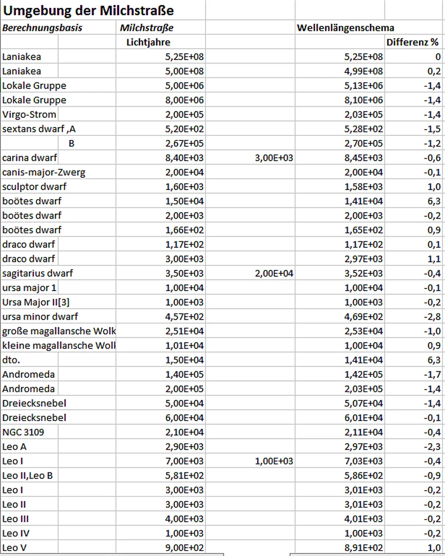 Im folgenden Text werden Daten kosmischer Objekte untersucht, ob sie das Wellenlängengesetz erfüllen. Dabei muss man "zu Fuß" im Wellenlängenschema nach einem Wert mit einer möglichst geringen Abweichung/ Differenz suchen. Die überwiegend sehr geringen Differenzen zwischen den Messwerten und den mit dem Wellenlängengesetz berechneten Werten beweisen die allgemeine Gültigkeit des kosmischen Wellenlängengesetzes.