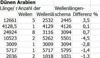 Dünen haben ein ausgeprägtes Wellenmuster. In Tabelle 8 sind einige Dünen aus der arabischen Wüste mit den Werten aus dem Wellenlängenschema verglichen. Sie zeigen wie auch die Muster von Strandrippeln (Bild 2) eine gute Übereinstimmung.