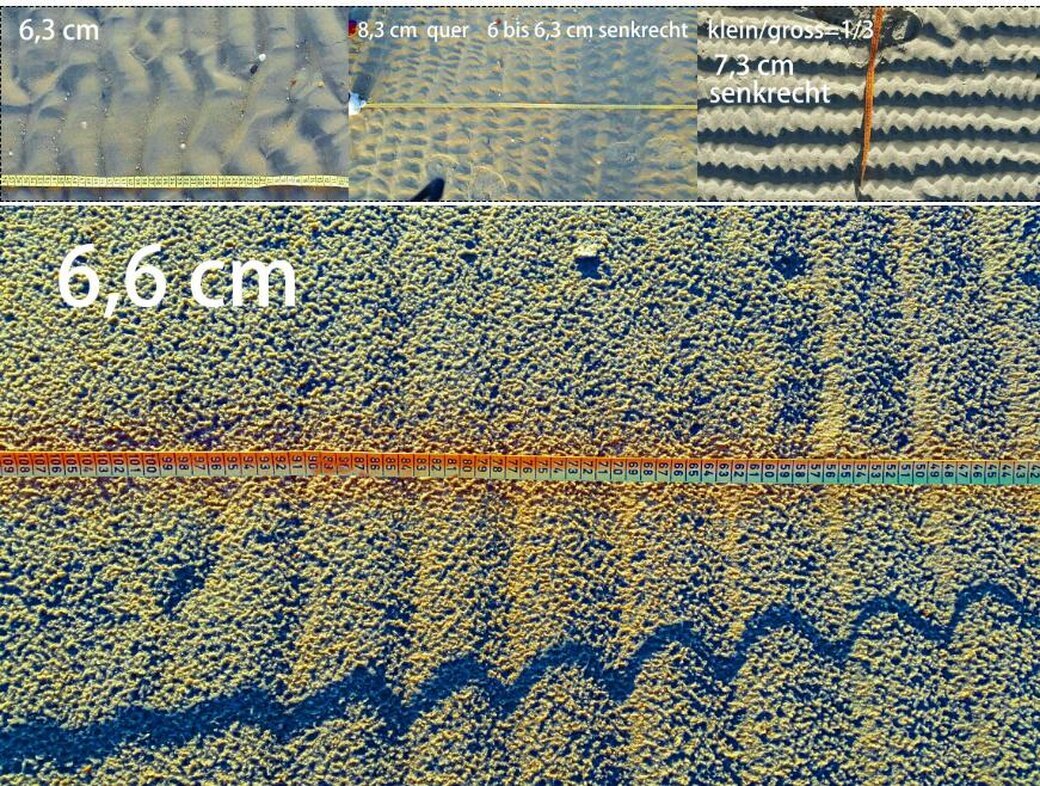Strandrippel und Dünen entstehen, wenn der Sand durch die Strömung aufgewirbelt wird und einen fluiden Zustand erreicht. Der fluide Zustand ist notwendig, um die im fluiden Medium vorhandenen Wellenstrukturen abzubilden. Bild 14 zeigt außerdem, wie sich zwei oder drei Wellenstrukturen überlagern. Dabei treten häufige Störungen des gleichmäßigen Wellenprofils auf. Ähnliche Bilder sind auf der Erdoberfläche sehr häufig vorhanden.