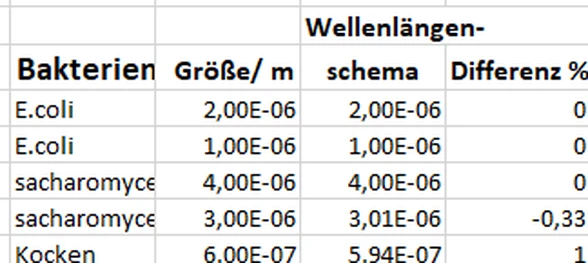 Das Wirken des Wellenlängengesetzes lässt sich sogar bei der Größe von Bakterien nachweisen (Tabelle 4), auch wenn die Datenlage bei den Bakterien sehr dünn ist.