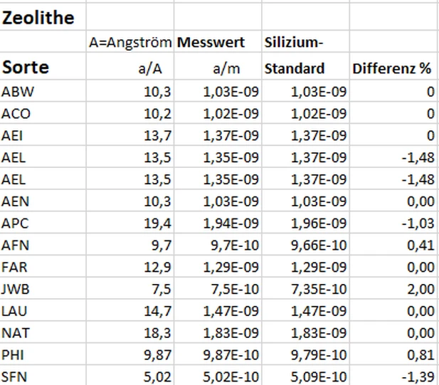 Zeolithe (Tabelle 2) sind gut untersuchte Moleküle. Weil ihre Eigenschaften von ihrer Struktur abhängen, werden sie sehr genau vermessen. Die Übereinstimmung der Messwerte mit dem Wellengesetz ist sehr gut.