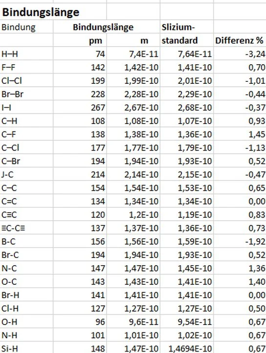 Durch das Wellengesetz wird die Größe von Atomen festgelegt. Es sollte auch für von Molekülen gelten, weil sie aus Atomen zusammen gesetzt sind. Die Bindungslängen in Molekülen zeigt (Tabelle 1).