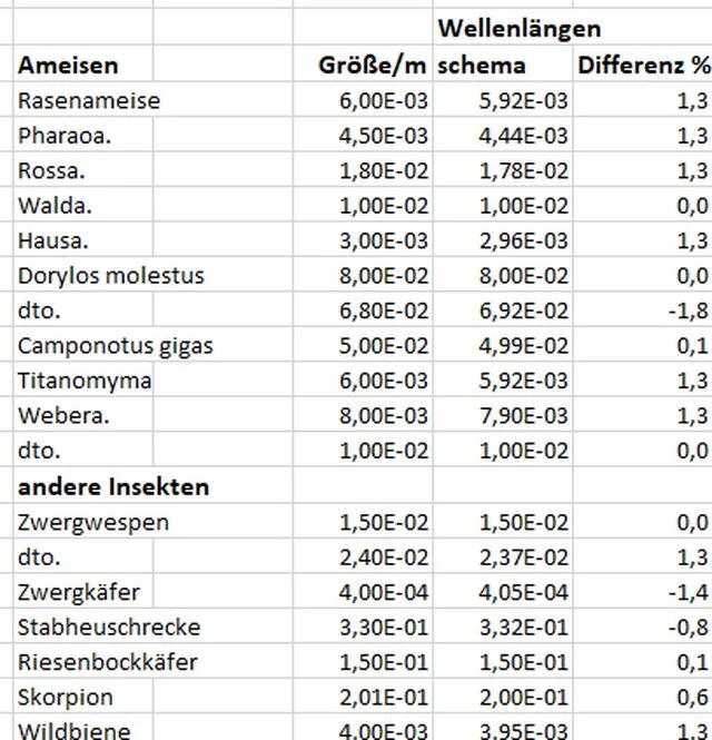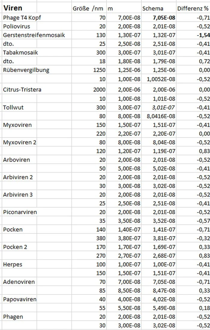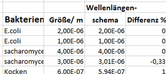 Das Wirken des Wellenlängengesetzes lässt sich sogar bei der Größe von Bakterien nachweisen (Tabelle 4), auch wenn die Datenlage bei den Bakterien sehr dünn ist.