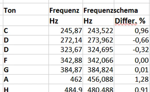 Tabelle 10 enthält die Töne menschlicher Musik. Sie sind im kosmischen Frequenzgesetz zu finden! Das ist nicht zu erwarten, weil Empfinden, "Seele" und Kultur eine dominante Rolle spielen sollten.