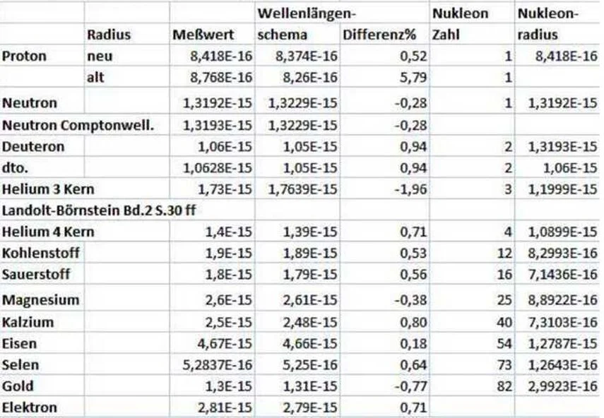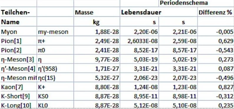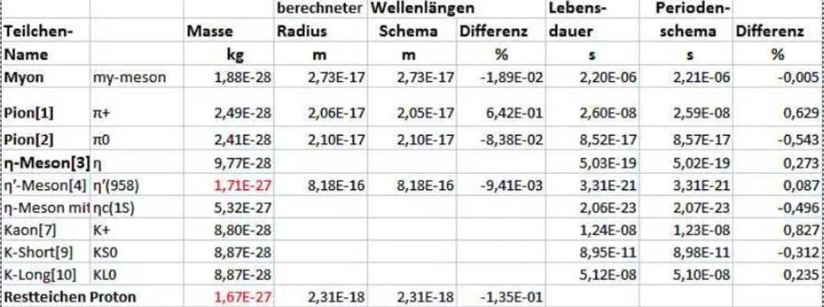 Tabelle 7 zeigt die gemessenen Zerfallszeiten von Mesonen. Sie stimmen sehr gut mit Daten aus dem Periodenschema, das aus dem Wellenlängenschema zu berechnen ist, überein. Wenn man anerkennt, das beim Zerfall von Teilchen ihre Bestandteile entstehen, kann man sehr einfache Modelle für die Struktur der Teilchen aufstellen und ihre Größe berechnen. In Tabelle 8 sind die Radien von Myonen aufgelistet. Auch diese Werte erfüllen sehr gut das Wellenlängengesetz.