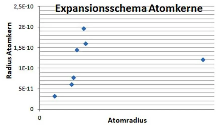 Bild 1 zeigt die Abhängigkeit des Radius der Atomkerne vom Atomradius. Man sieht eine Ähnlichkeit zu den Expansionsschemata der planetaren Mondsysteme. Auch wenn die Datenlage bei den Atomkernen dürftig ist, kann man erkennen, dass die Atome, die Atomkerne als auch das Proton und das Neutron durch Expansion entstanden sind (Proton und Neutron siehe "Eine Welt ohne Quarks").