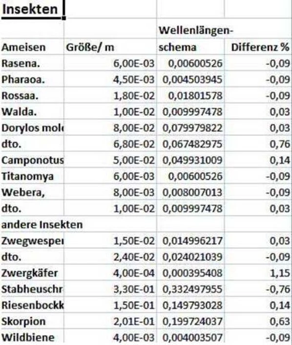 Wenn für die Bindungslängen ( Anhang, Tabelle 7) das Wellenlängengesetz gilt, ist das auch für Biopolymere zu erwarten. Tabelle 11 zeigt die Daten von RNA und DNA. Gleiches muss auch für Viren, die aus DNA oder RNA aufgebaut sind, gelten (Tabelle 12). Das Wirken des Wellenlängengesetzes lässt sich sogar bei der Größe von Bakterien nachweisen (Tabelle 12), auch wenn die Datenlage bei den Bakterien sehr dünn ist.