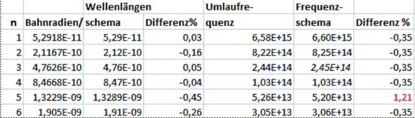 Wegen der guten Übereinstimmung der Daten in Tabelle 1 war das auch für die Daten des Wasserstoffatoms zu erwarten. Bei den Bahndaten (Tab.2) tritt für n=5 eine größere Abweichung zum Wellenlängen-und Frequenzschema auf, für die es noch keine Erklärung gibt.
