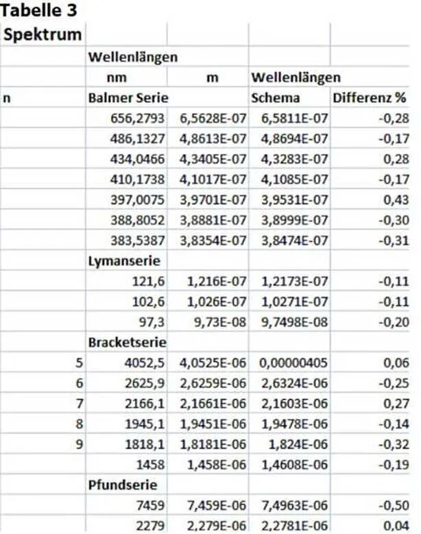 Die Linien im Wasserstoffspektrum folgen dem Wellenlängengesetz (Tabelle 3)
