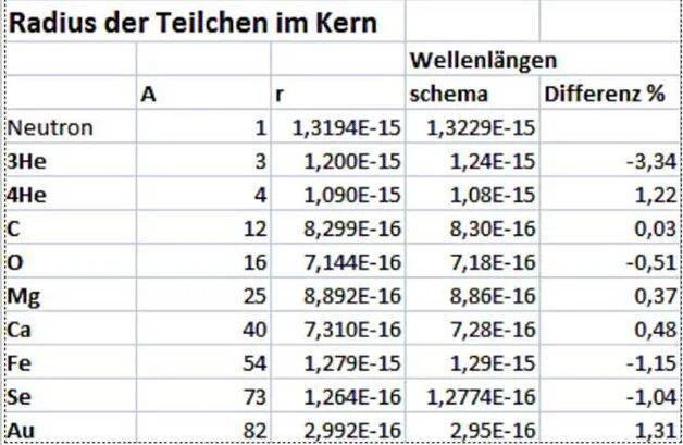 Aus dem Radius der Atomkerne (Kugelform vorausgesetzt) wurde der Radius der Teilchen im Kern (Elektronen) berechnet