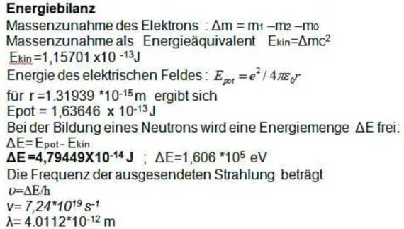 Beim β-Zerfall n = p+ + e- ist die Massenbilanz positiv. Um sie auszugleichen, wird die Emission eines Neutrinos angenommen. Dabei wird übersehen, dass das ausgesendete Elektron die Arbeit Epot im elektrischen Feld leisten muss. Die Energiebilanz ergibt, dass die bei der Bildung des Neutrons abgestrahlte Energie ΔE=4,79449X 10-14 J beim β-Zerfall zugeführt werden muss.