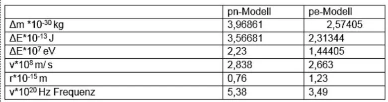 Das pn-Modell bringt einen Wert für die den Radius, der geringer ist, als der Radius des Protons. Mit dem pe-Modell erhält man für r=1,23* 10-15m und für den Abstand der Protonen d=2r=2,46*10-15 m. C.E.Nebel/ W.Schottky geben den Kerndurchmesser mit 2,08 *10-15m an. Neuester Wert aus dem Internet: 2.127 99 x10-15 m.