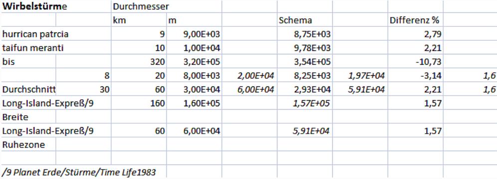 Tabelle 6 zeigt, dass Wirbelstürme und Tornados Wellenstrukturen sind, denn ihre Maße erfüllen das Wellengesetz.