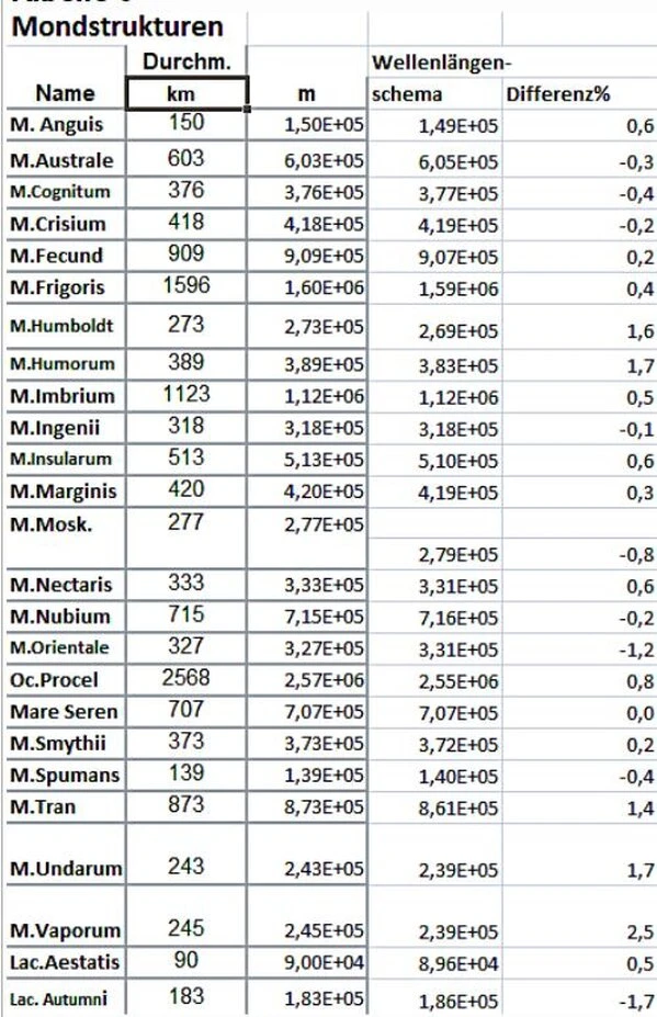 Der Mond der Erde hat keine Eigenrotation. Er hat wahrscheinlich schon sehr lange keine Rotation, denn sonst müssten sich noch Reste von Wellenstrukturen, wie sie die Erde hat, auf seiner Oberfläche finden lassen. Seine Oberfläche weist aber zahlreiche kreisförmige Strukturen auf, die ehemalige Vulkane sind und deren Durchmesser dem Wellengesetz gehorchen (Tabelle 6). Die ideale Kreisform beweist, dass es sich um thermische Drehstrukturen handelt. Für die Drehung gibt es aber keine äußeren Ursachen wie Turbulenz.