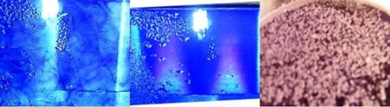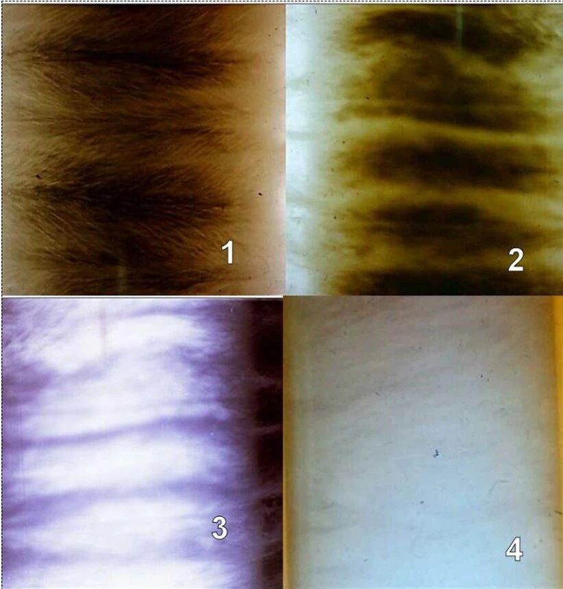 Die Strukturen auf Bild 3 werden von Pflanzenresten gebildet, die durch die Wellen suspendiert wurden. Ein Ausmessen war leider nicht möglich. Bild 4 zeigt Wellenstrukturen, die sich beim Durchtritt von Zugluft in meiner Wohnung an einem Fensterspalt durch Ablagerung von Dieselfeinstaub gebildet haben. (Die Reinigung dieses Teiles des Fensters ist verboten!) Beim Ausmessen der Struktur erhält man eine sehr geringe Abweichung zu dem Wert nach dem Wellenlängengesetz, dessen Gültigkeit für die Wellenstrukturen in Strömungen damit bestätigt ist.