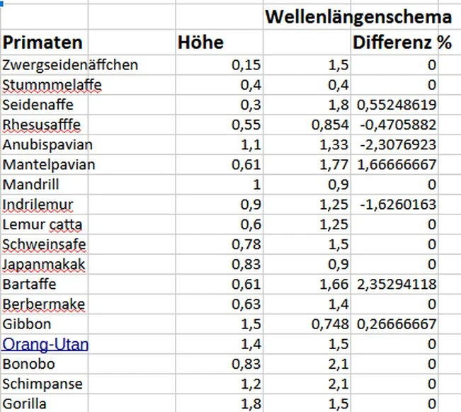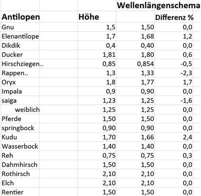 Auch bei höheren Organismen /Tabellen 7, 8, 9 und 10 erkennt man überraschend noch einen Einfluss des Wellenlängengesetzes ! Das ist überraschend, weil man bisher die Lebensumstände, denen ein Organismus ausgesetzt ist, für die Größe eines Individuums für entscheidend betrachtet. Wenn das Wellengesetz die Größe eines Individuums festlegt, sollte das auch für alle Körperteile gelten. Der Versuch das bei der Größe menschlicher Knochen zu beweisen, scheitert. Die meisten Knochen sind Teile von Gelenken, wo sie sich überlappen.