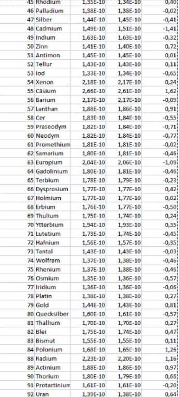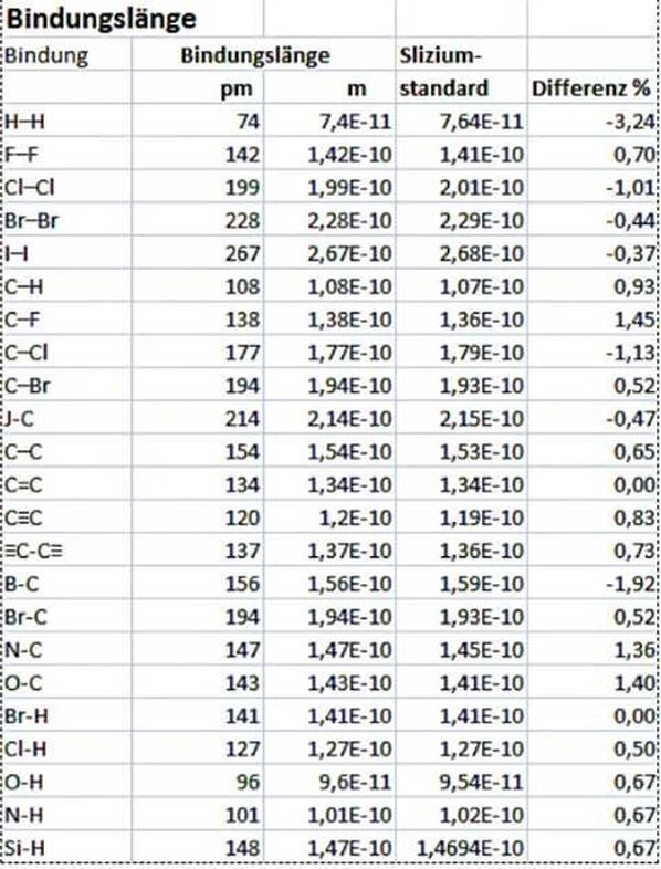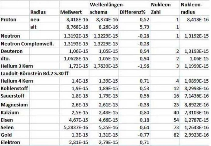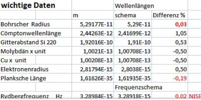 sehr gute Übereinstimmung zu den Daten des Wellenlängenschemas. Etwas größere Abweichungen treten auf, wenn einzelne Atome im Kristallgitter nachträglich durch Fremdatome ersetzt wurden. Die gute Übereinstimmung setzt sich auch bei den Atomradien (Tabelle 5), Bindungslängen in Molekülen (Tabelle 7) und den Radien der Atomkerne, Neutron und Proton (Tabelle 8) fort.