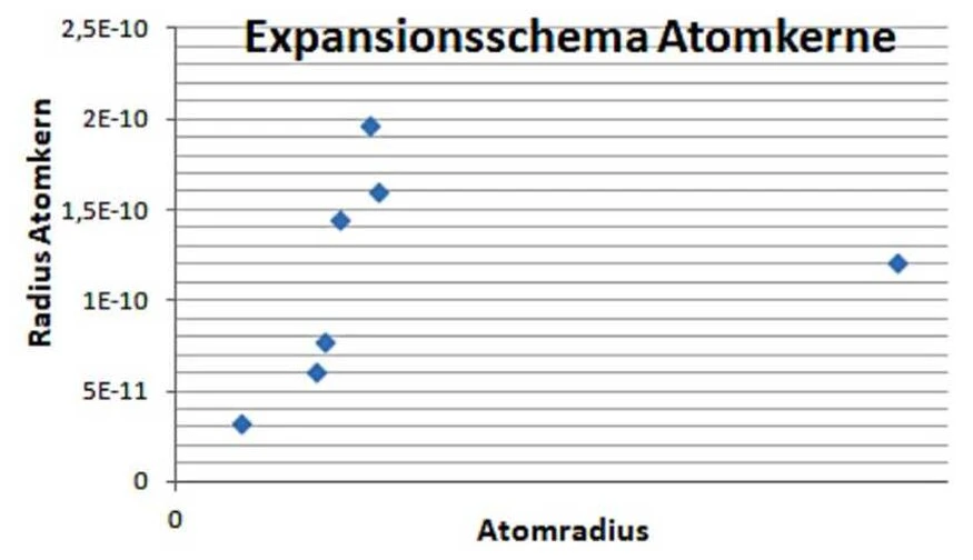 Bild 1 zeigt die Abhängigkeit des Radius der Atomkerne vom Atomradius. Man sieht eine Ähnlichkeit zu den Expansionsschemata der planetaren Mondsysteme. Auch wenn die Datenlage bei den Atomkernen dürftig ist, kann man erkennen, dass die Atome, die Atomkerne als auch das Proton und das Neutron durch Expansion entstanden sind (Proton und Neutron siehe "Eine Welt ohne Quarks").