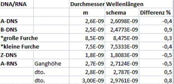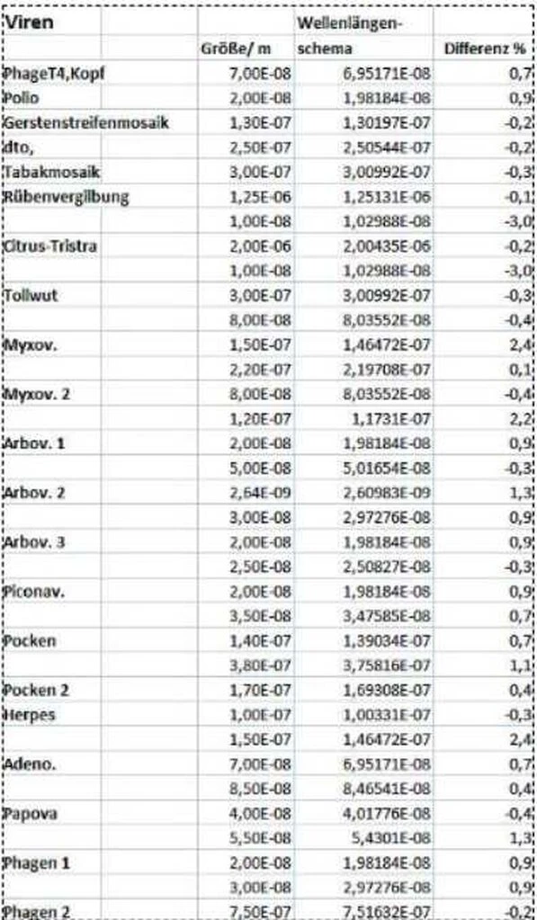 Wenn für die Bindungslängen ( Anhang, Tabelle 7) das Wellenlängengesetz gilt, ist das auch für Biopolymere zu erwarten. Tabelle 11 zeigt die Daten von RNA und DNA. Gleiches muss auch für Viren, die aus DNA oder RNA aufgebaut sind, gelten (Tabelle 12). Das Wirken des Wellenlängengesetzes lässt sich sogar bei der Größe von Bakterien nachweisen (Tabelle 12), auch wenn die Datenlage bei den Bakterien sehr dünn ist.