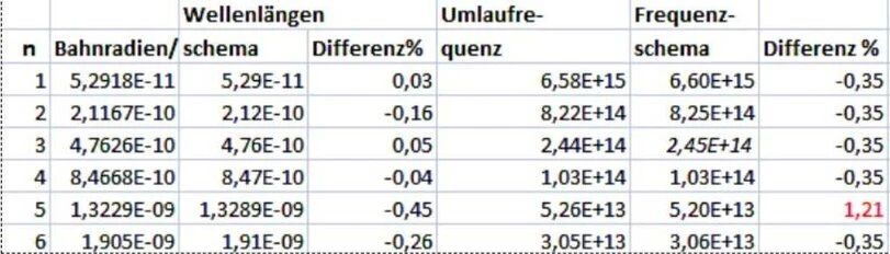 Wegen der guten Übereinstimmung der Daten in Tabelle 1 war das auch für die Daten des Wasserstoffatoms zu erwarten. Bei den Bahndaten (Tab.2) tritt für n=5 eine größere Abweichung zum Wellenlängen-und Frequenzschema auf, für die es noch keine Erklärung gibt.