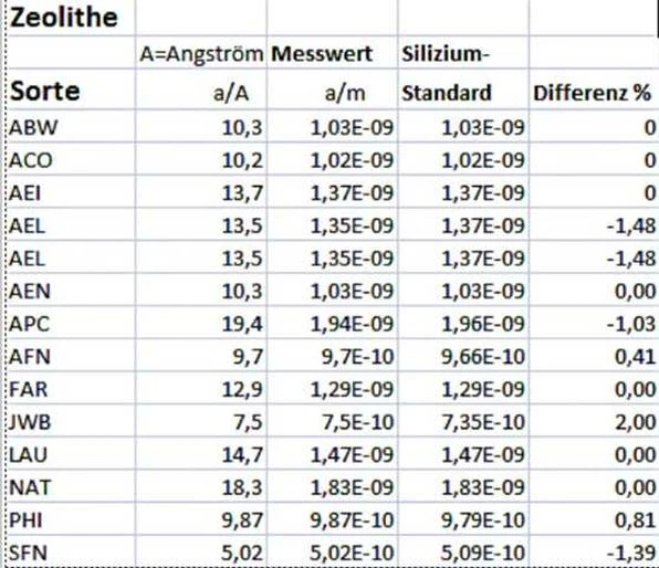 Ich habe einige Kristalle aus meiner Mineraliensammlung von Hand ausgemessen (Anhang Tabelle 4). Die Abmessungen der Kristalle passen sehr gut in das Wellenlängenschema. Auch die Abmessungen synthetische Kristalle/ Zeolithe zeigen eine